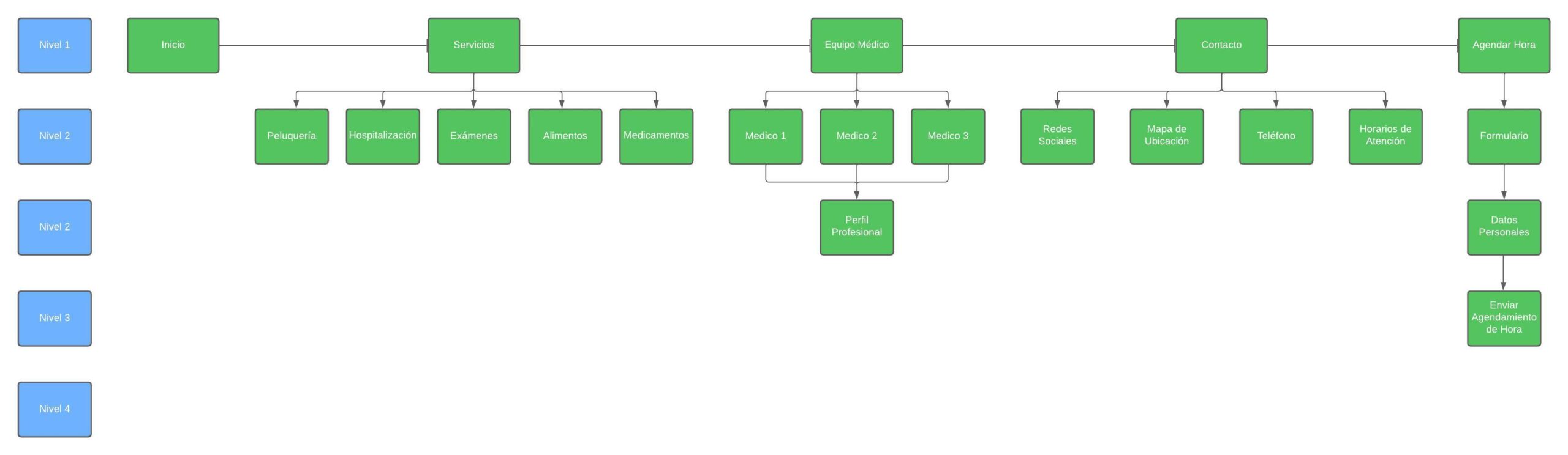El mapa del sitio web servirá como una guía visual para organizar de manera efectiva la estructura y navegación de nuestra veterinaria, asegurando una experiencia fluida y coherente de los servicios a ofrecer, asegurando la facilidad para el agendamiento de hora para los usuarios.